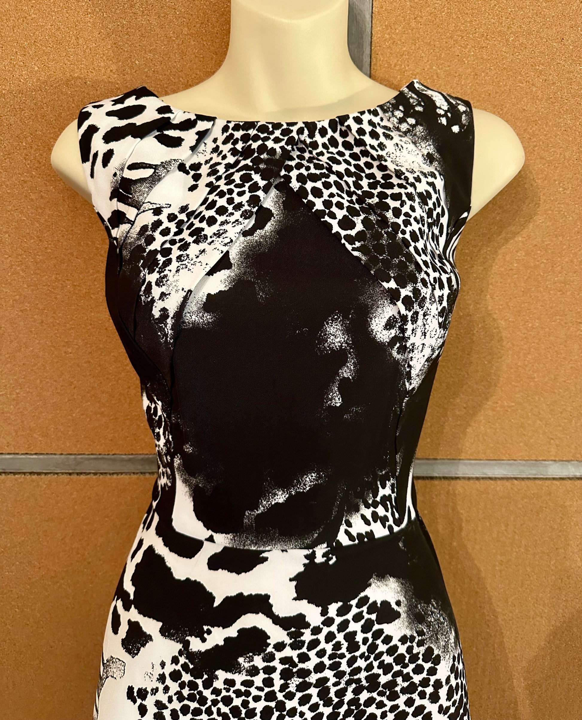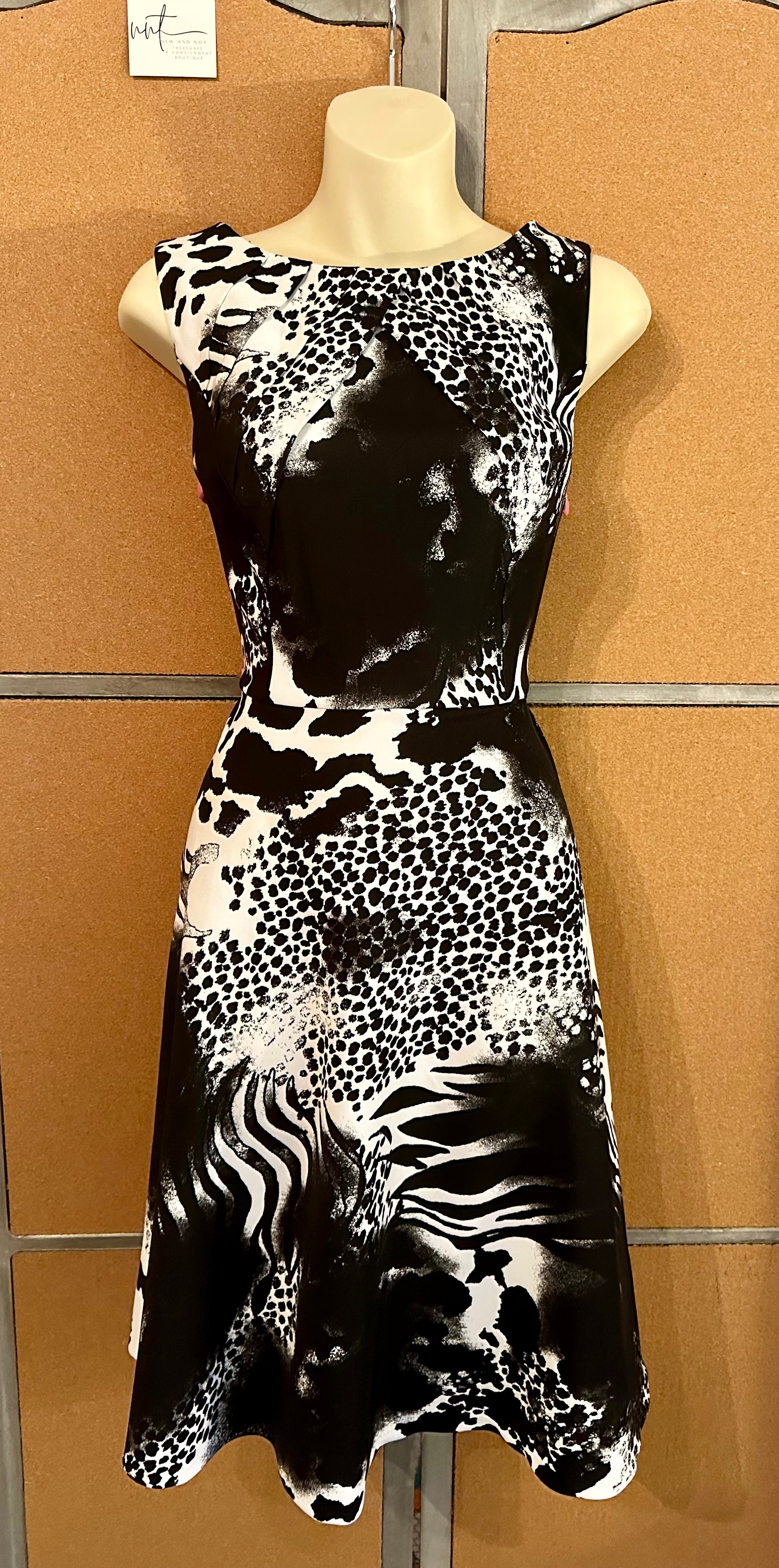 Sophisticated and modern AGB Dress in a striking black and white abstract animal print. This sleeveless fit-and-flare silhouette flatters the figure while remaining effortlessly polished. Features diagonal pleated detailing at the upper chest (pictured) and a hidden back zipper for a smooth finish. Perfect for office wear, luncheons, or professional events.