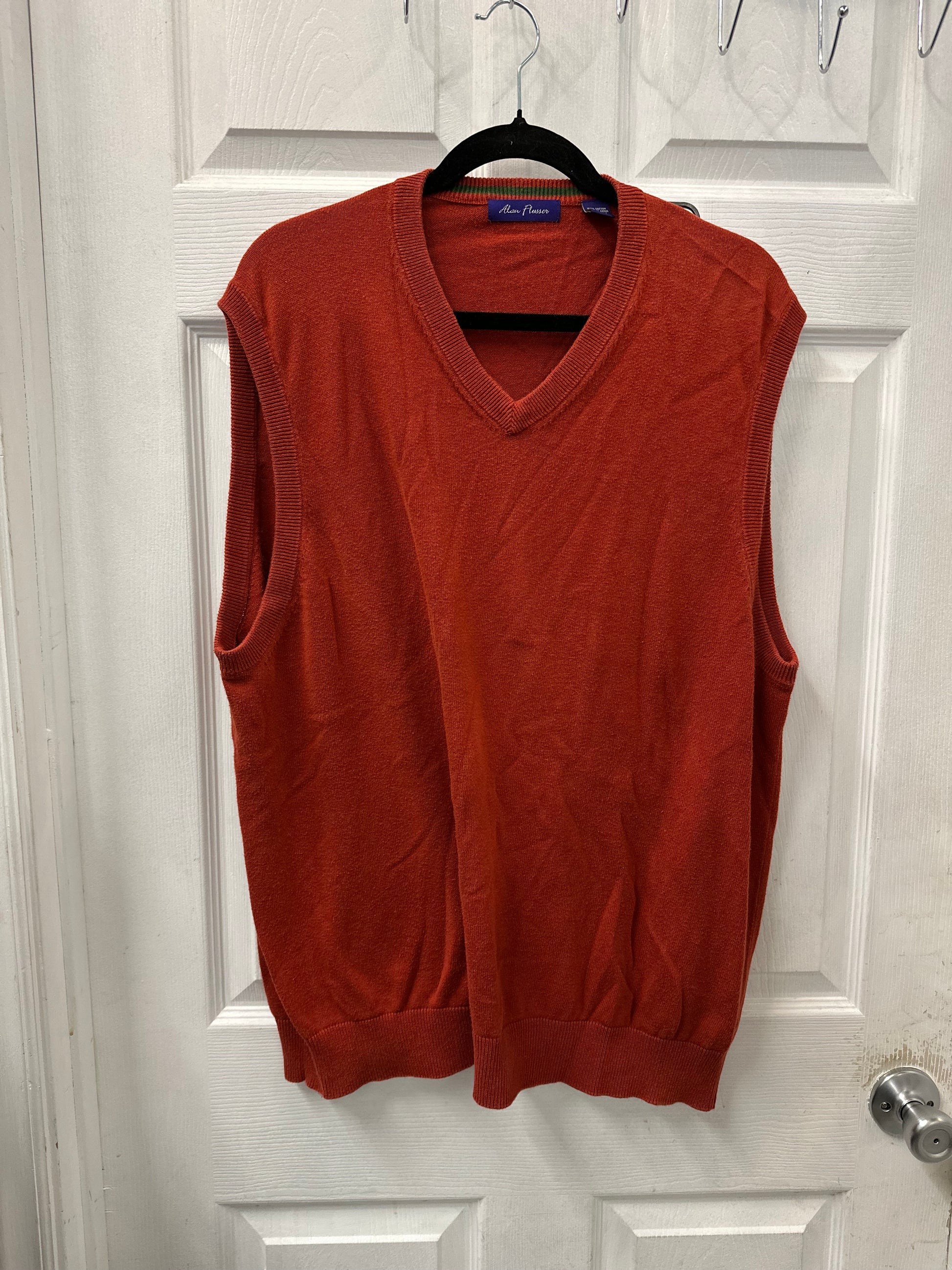 This Alan Flusser sweater vest in a vibrant orange color is the perfect addition to your wardrobe. Made with the highest quality materials, it combines the classic style of a vest with the cozy comfort of a sweater. Look stylish and stay warm with this XL size vest from the renowned Alan Flusser brand.