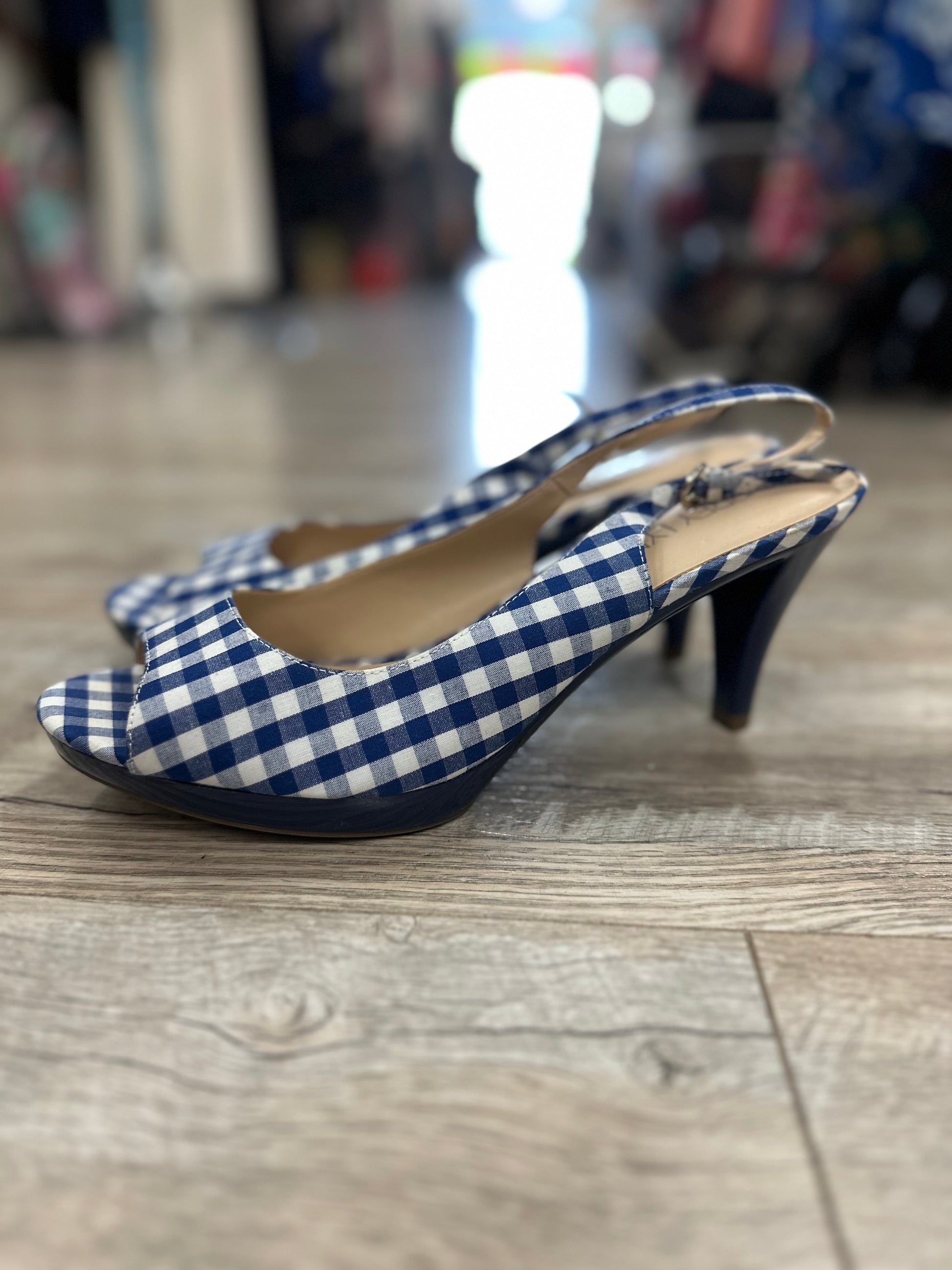 Aubrey Lynn Blue Check Peep Toe Heels in 9.5