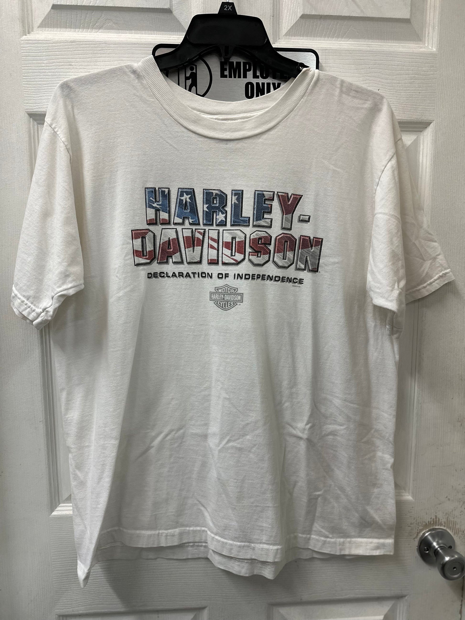 Rev up your style with this Harley Davidson Declaration of Independence graphic tee in XL. Featuring the iconic Harley Davidson brand, this mens shirt is in excellent used condition, making it a must-have for any biker or fan. Ride in style and show off your American pride with this shirt.