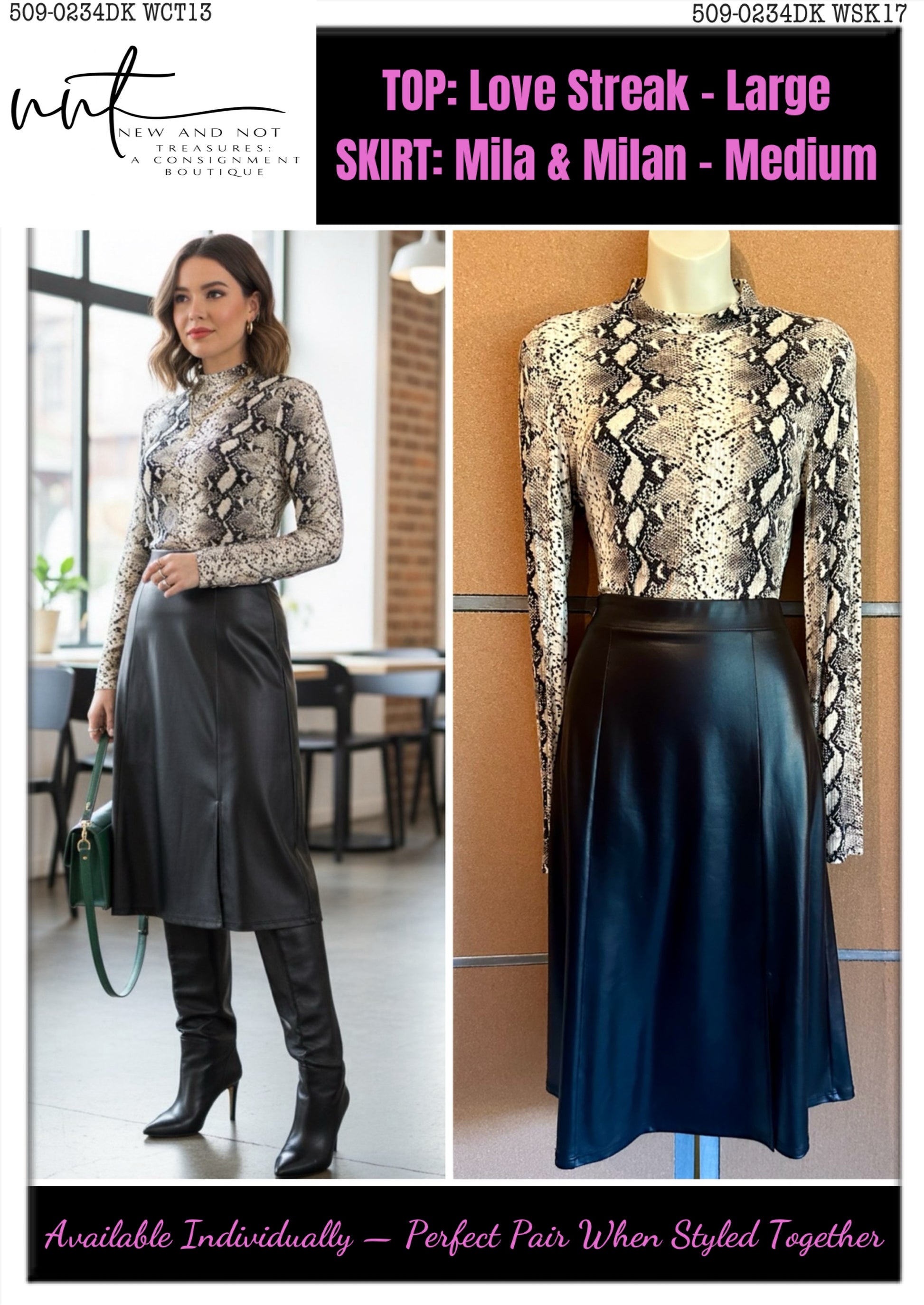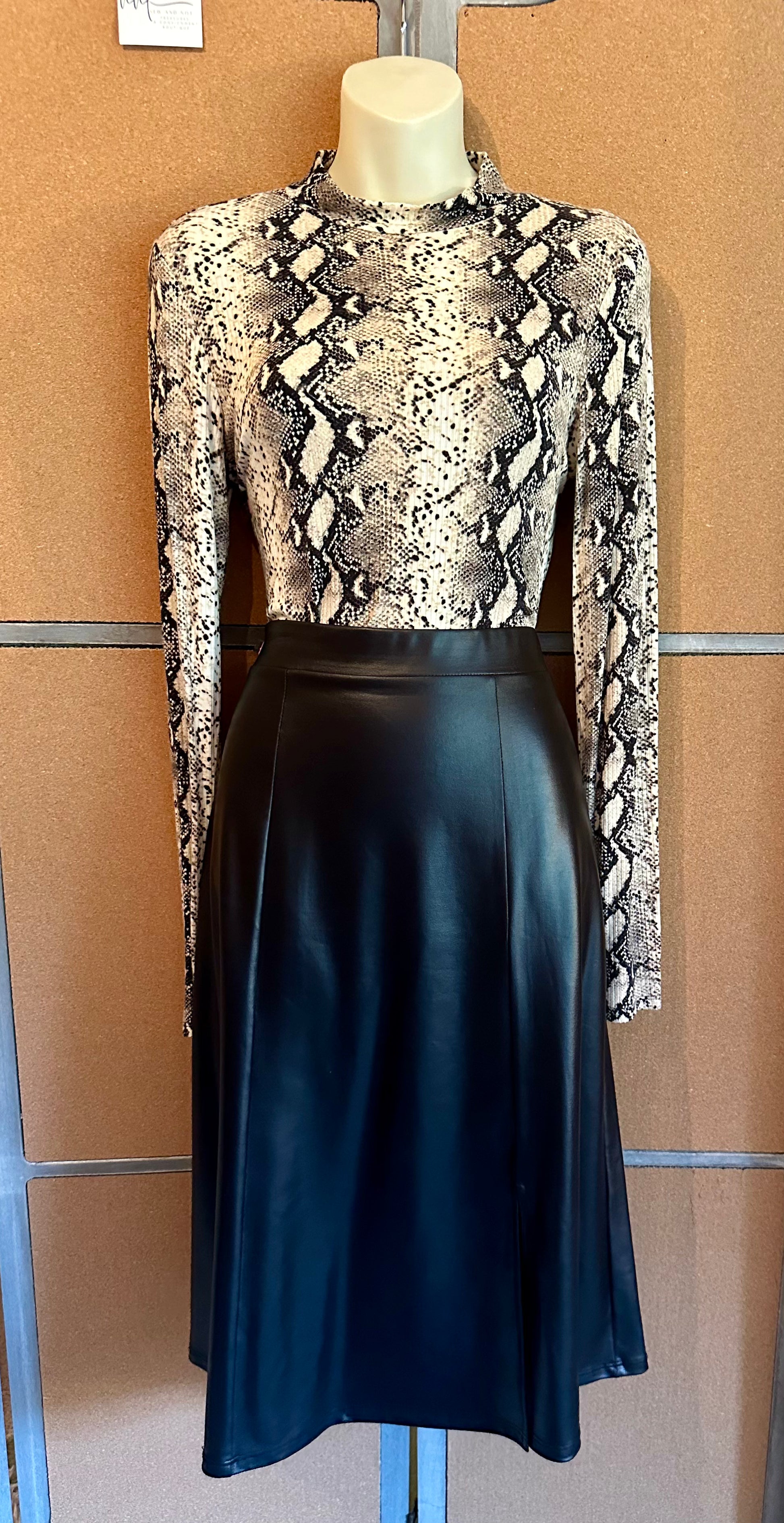 Soft rayon-blend fabric with a touch of stretch for a flattering fit. Features a neutral beige, black, and taupe snakeskin pattern that pairs beautifully with leather, denim, or tailored separates. Lightweight and comfortable — perfect for layering or styling solo for an elevated chic look.