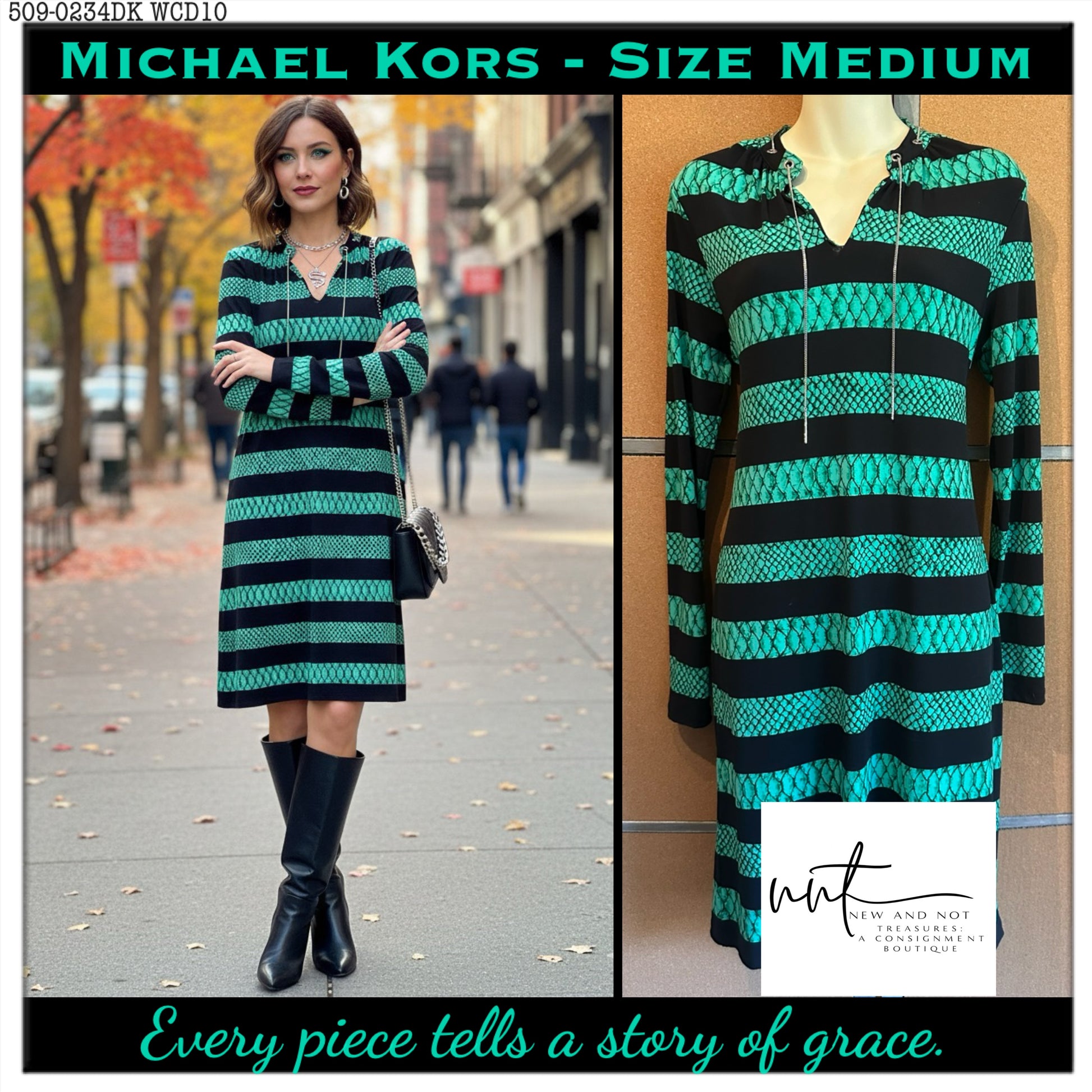 Chic and modern Michael Kors tunic dress featuring a bold green and black snakeskin-inspired stripe print. Designed in a soft stretch knit with long sleeves and a notched neckline accented by metallic ties.