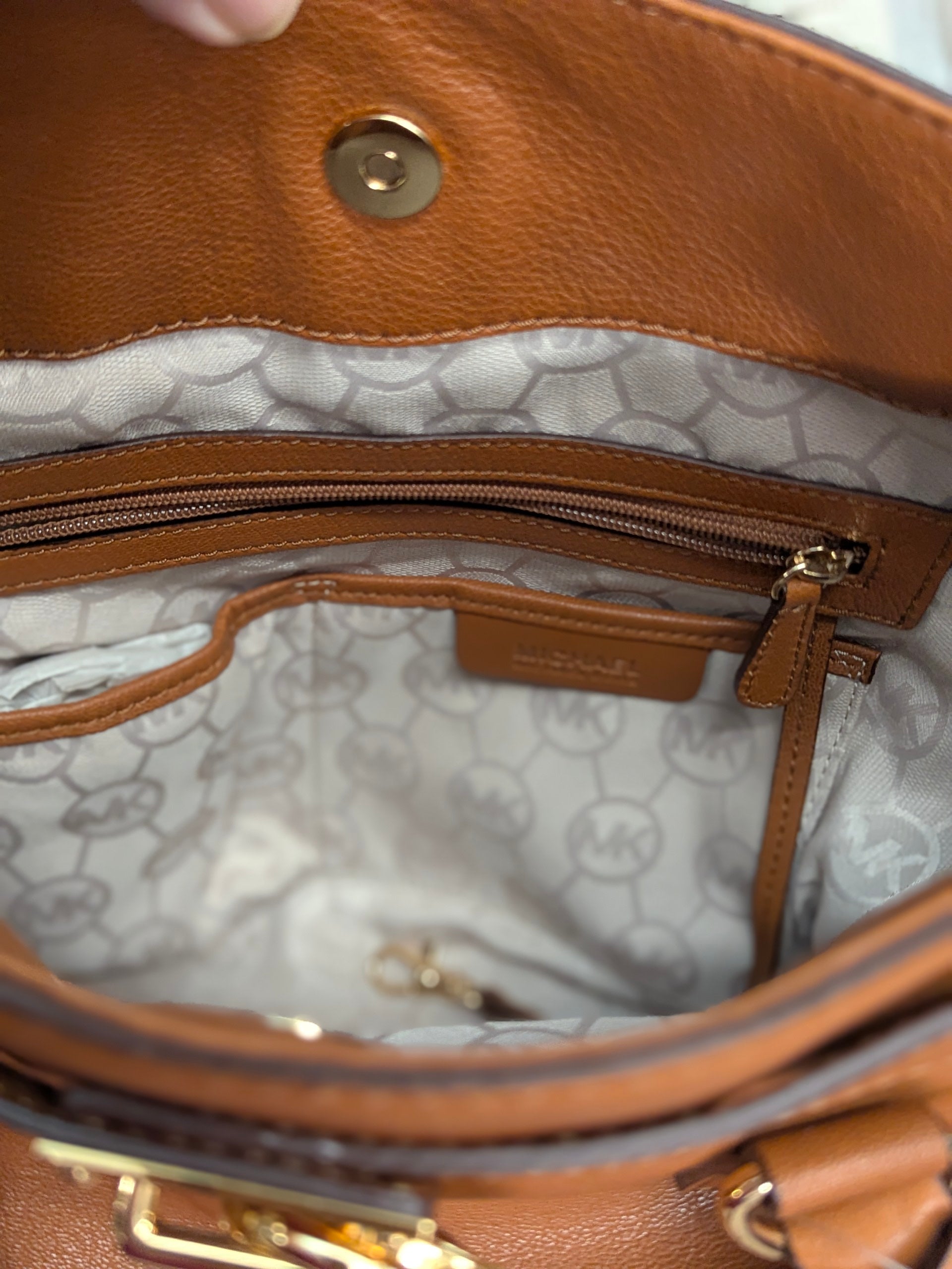 This is a Michael Kors large leather tote handbag in a rich cognac brown color. The bag features a structured silhouette with dual top handles and a removable shoulder strap for versatile carrying options. Gold-tone hardware accents the design, including a chain-link detail on one side and the signature MK logo lock charm on the front. It has a polished, sophisticated look, ideal for both professional and everyday wear. The smooth, durable leather gives it a timeless and luxurious appeal.