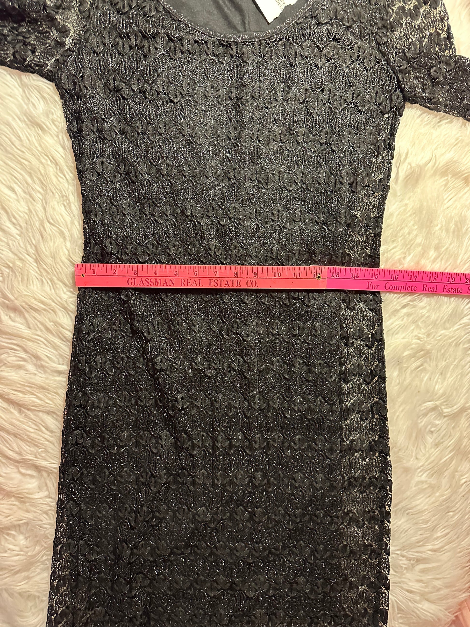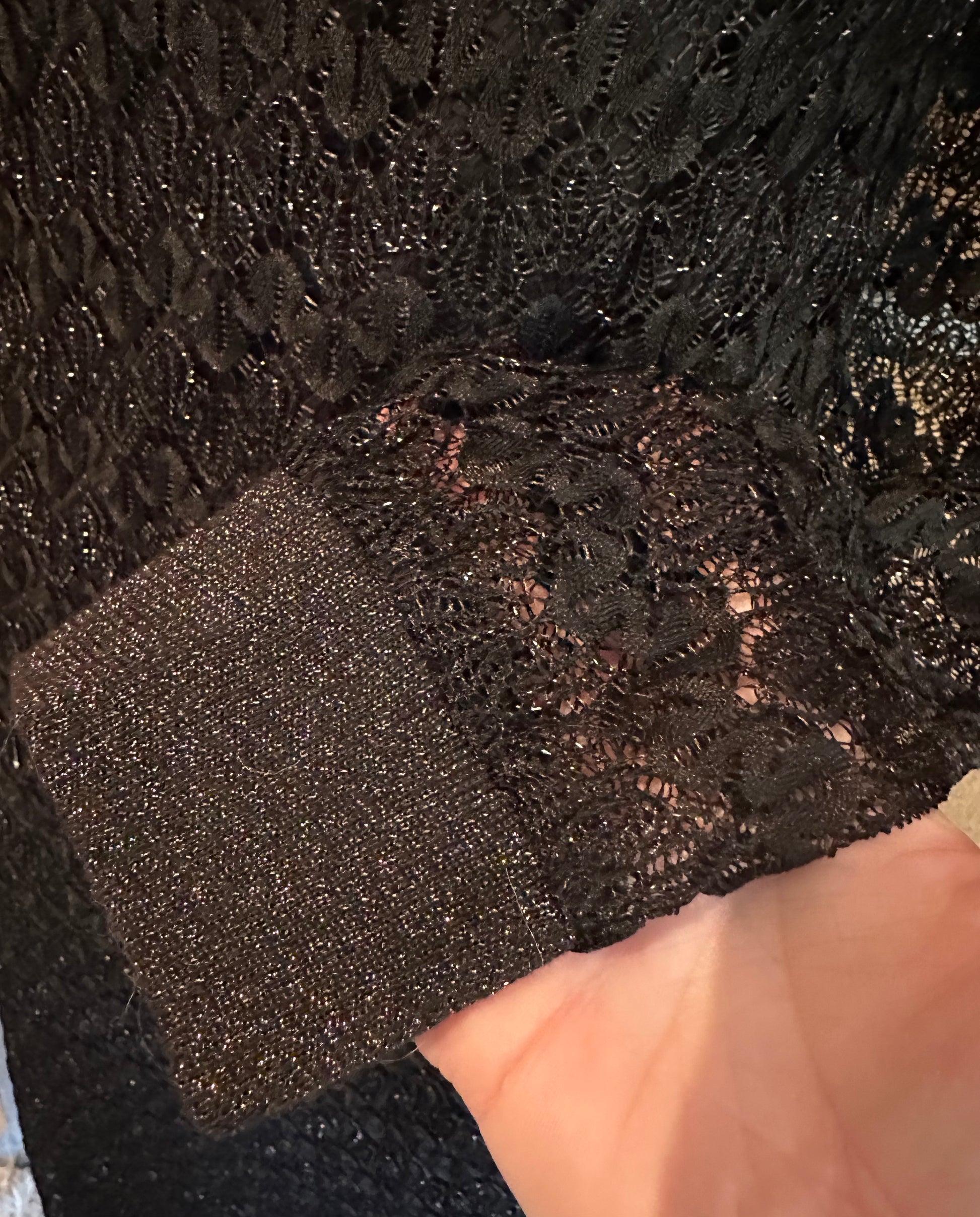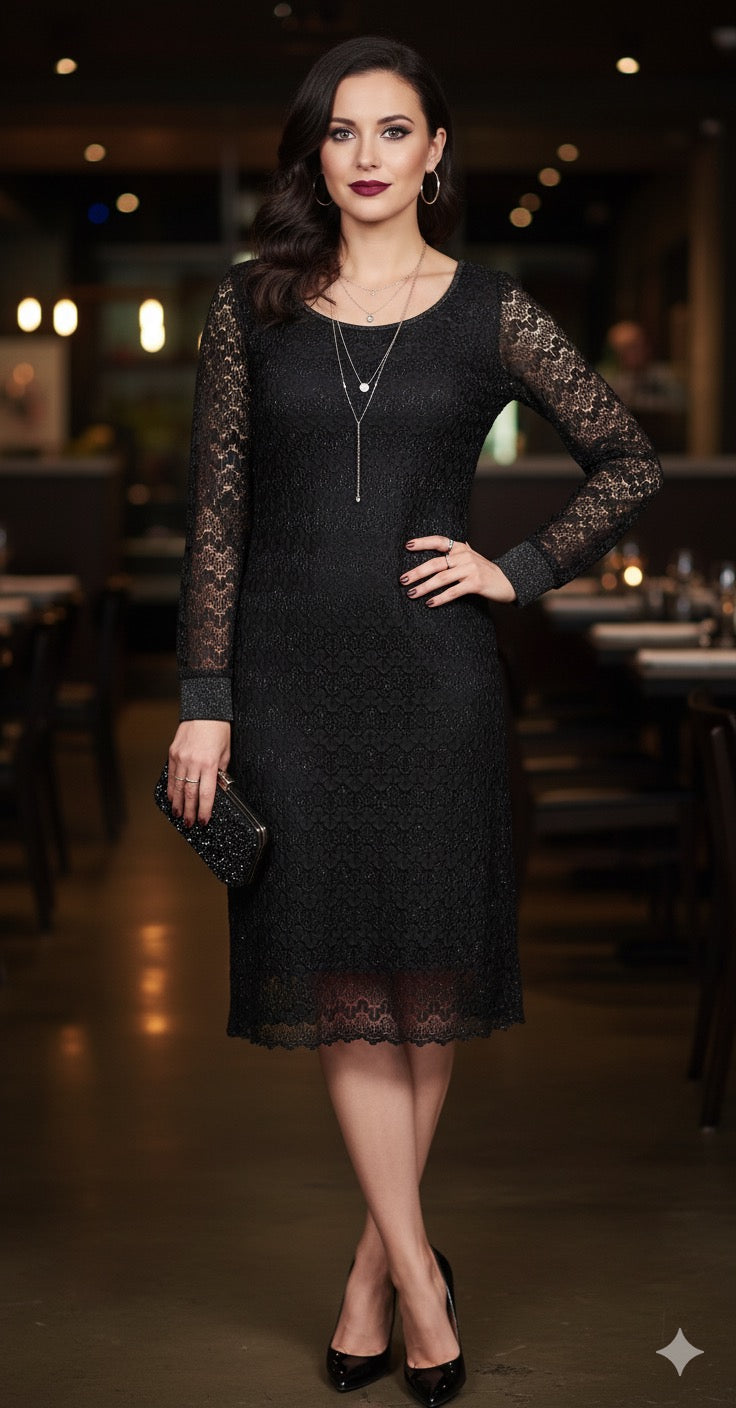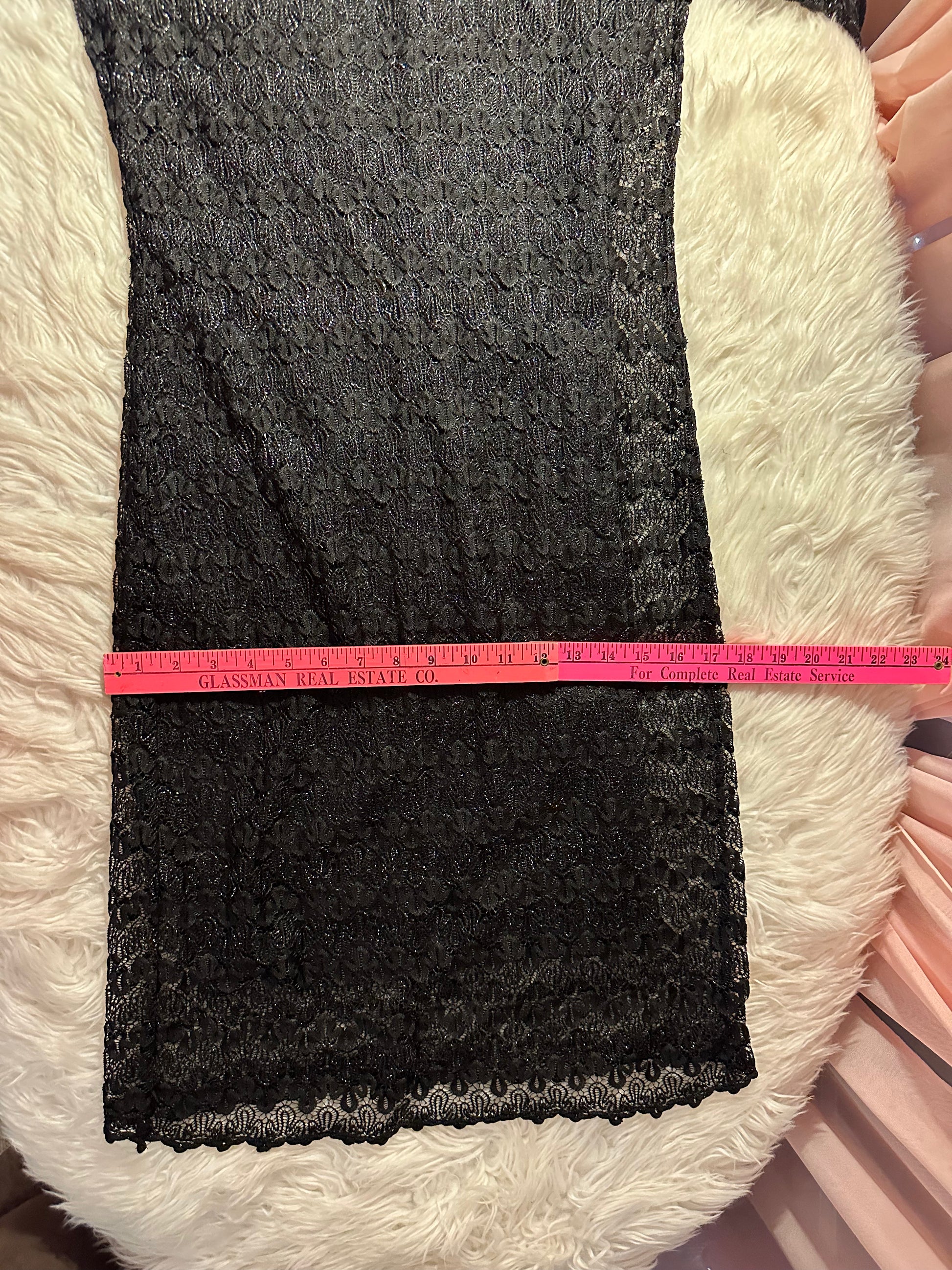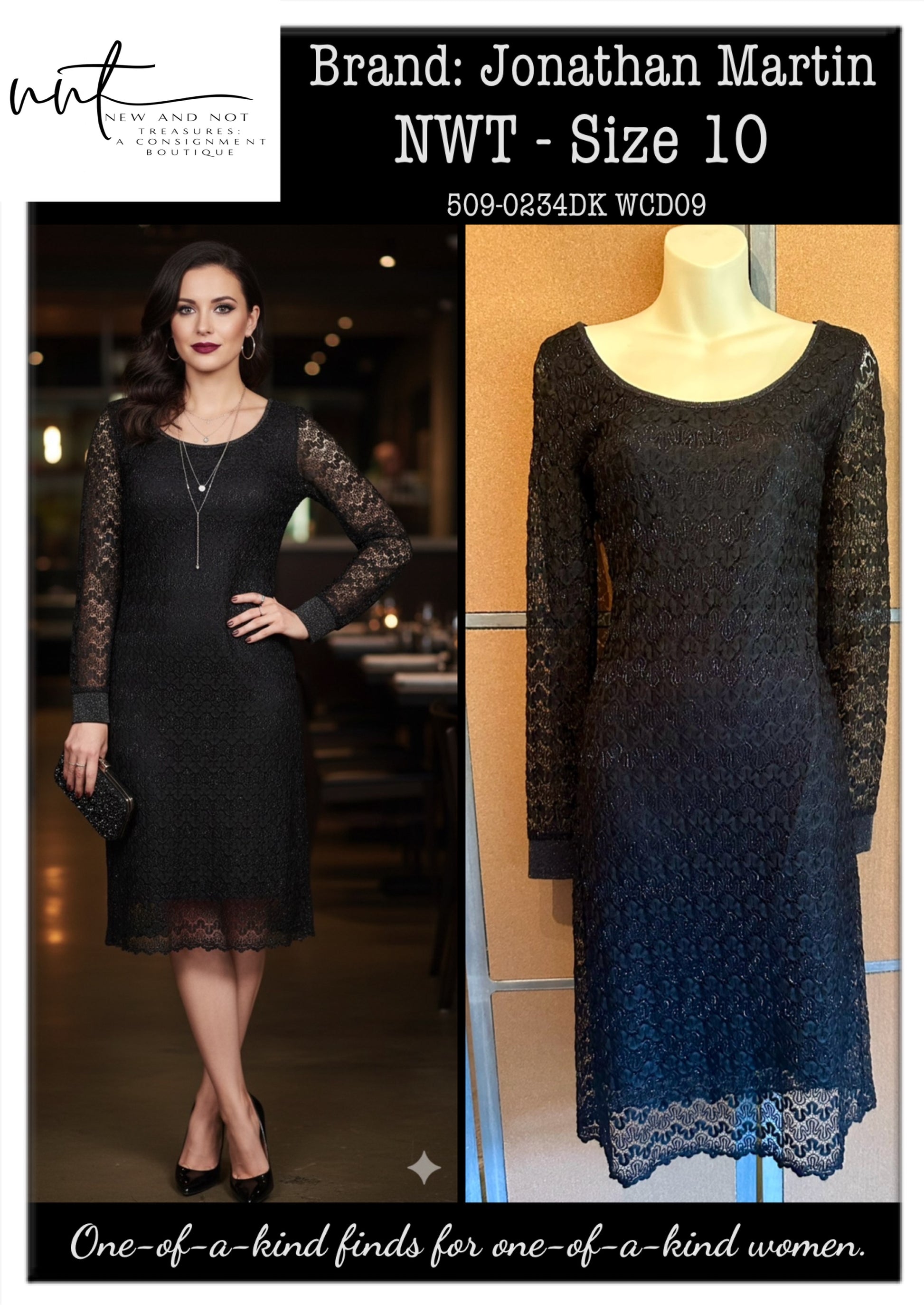 Elegant black lace sheath dress by Jonathan Martin, featuring subtle metallic accents that add a sophisticated shimmer. The semi-sheer lace overlay extends beyond the lined body for a graceful finish. Detailed with knot-style metallic cuffs and matching trim at the neckline. Perfect for cocktail parties, holiday gatherings, or special occasions. New With Tags (NWT).