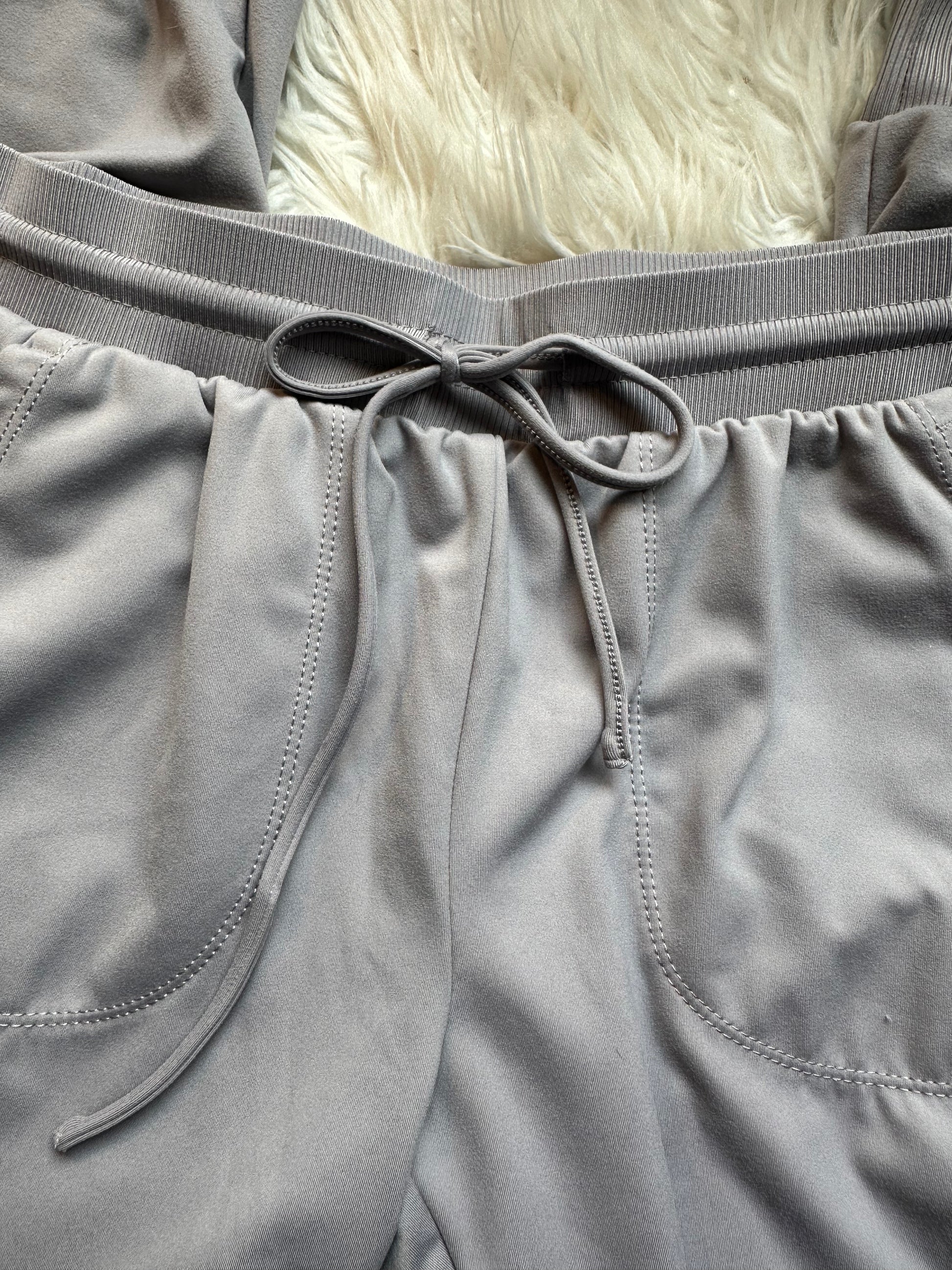 Stay comfortable and stylish with these Rachel Zoe joggers in light gray. Designed with a pull-on elastic waistband and adjustable drawstring tie, they feature roomy front patch pockets and ribbed ankle cuffs for a flattering tapered fit. Perfect for casual wear, lounging, or errands—these joggers combine function with effortless style.