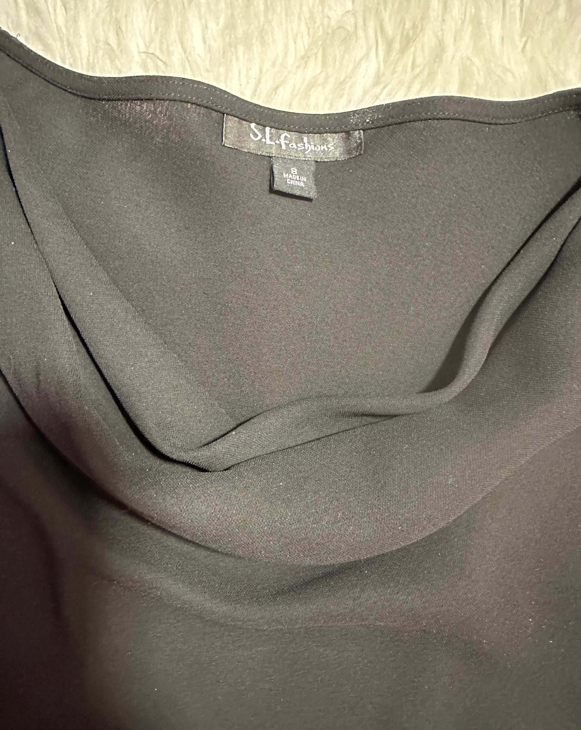 Beautiful two-piece black chiffon outfit by S.L. Fashions, size 8 (top and skirt).