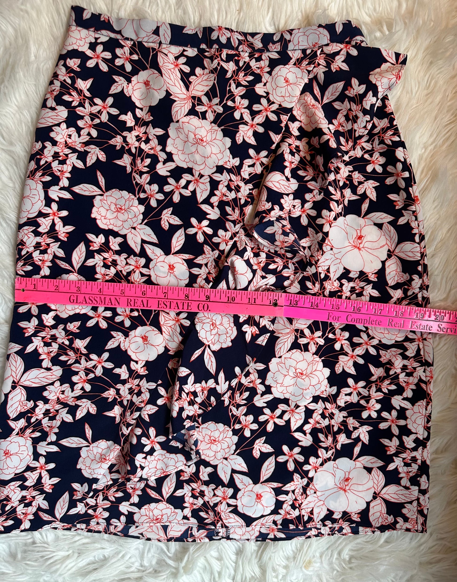 Beautiful Banana Republic floral A-line skirt featuring a navy background with soft white and red floral print. Designed with a subtle ruffle detail that extends diagonally across the front, adding a feminine and flirty touch. Crafted from 100% polyester that feels like lightweight rayon — smooth, flowy, and perfect for transitional weather.
