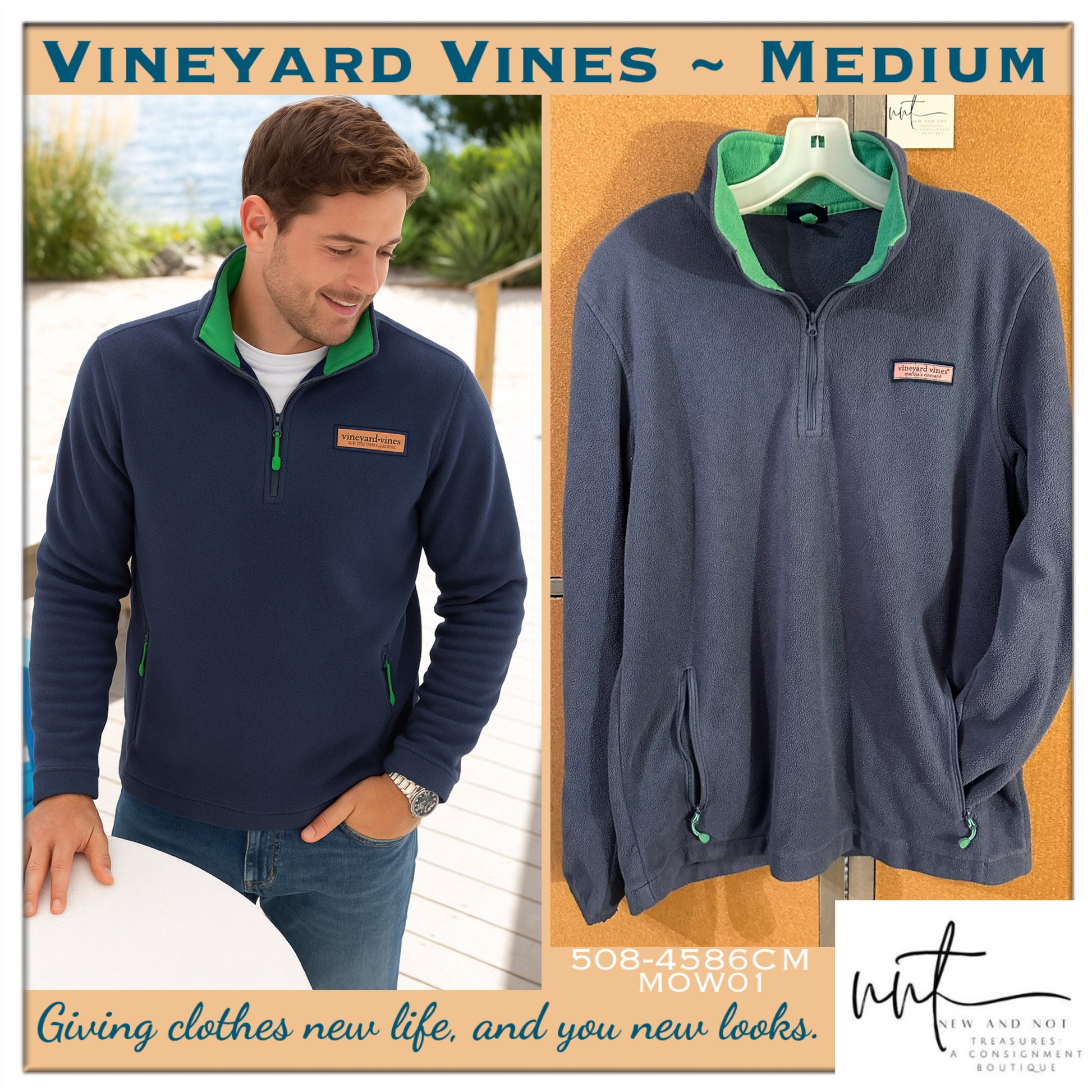 Classic Vineyard Vines men’s quarter-zip fleece pullover in navy blue with green trim and zipper pulls. Features the signature vineyard vines® martha’s vineyard chest logo patch and dual zippered pockets for convenience. Perfect for layering in cooler weather, offering both comfort and timeless style. Size Medium. Please review photos for details and condition.