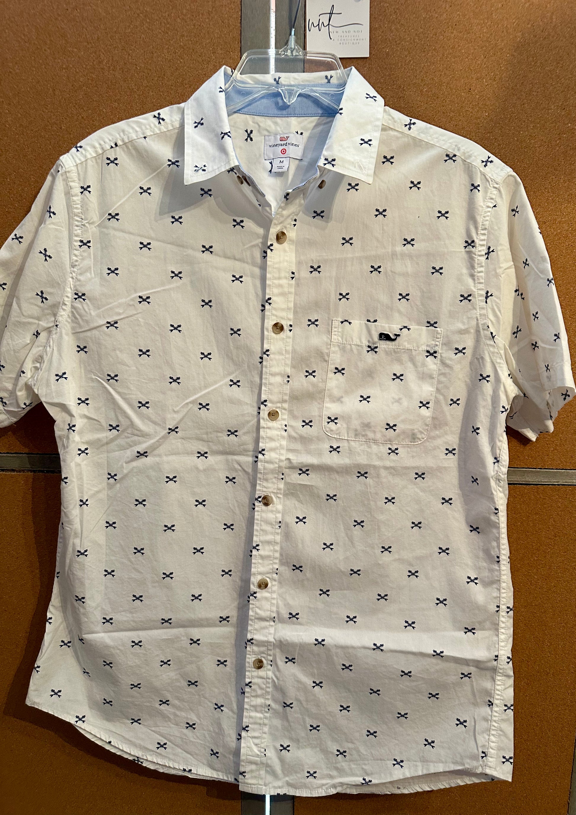 Vineyard Vines Sz M White Fish Skeleton Bones Print Short Sleeve Buttoned Shirt