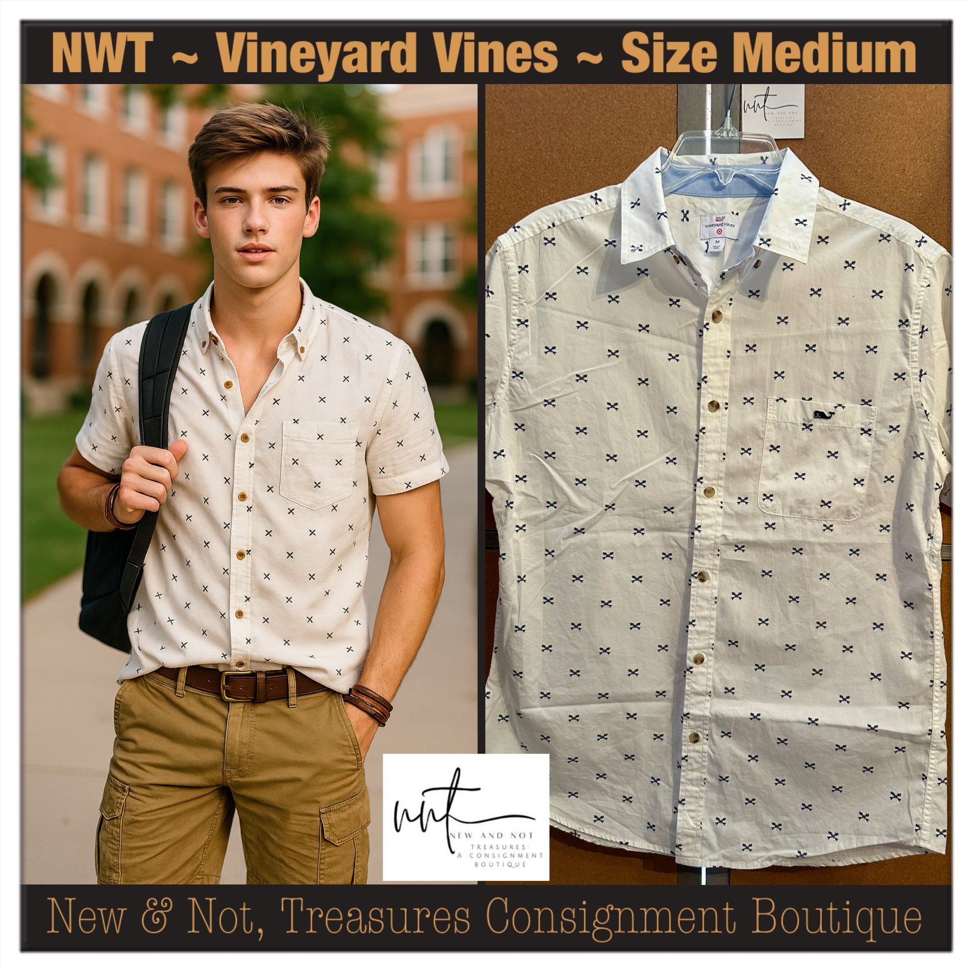 The Vineyard Vines sz M white fish skeleton bones print short sleeve buttoned shirt is a stylish and casual option for men. Made of cotton fabric with a woven texture, this shirt features a unique animal print pattern of fish skeletons, perfect for a summer, fall, or spring outfit. The collared neckline and button-down style add a touch of sophistication, while the regular fit ensures comfort and ease of movement. Machine washable and designed by the reputable brand Vineyard Vines, this shirt is a must-have for any man looking to make a statement with his fashion choices.