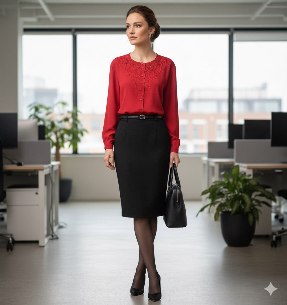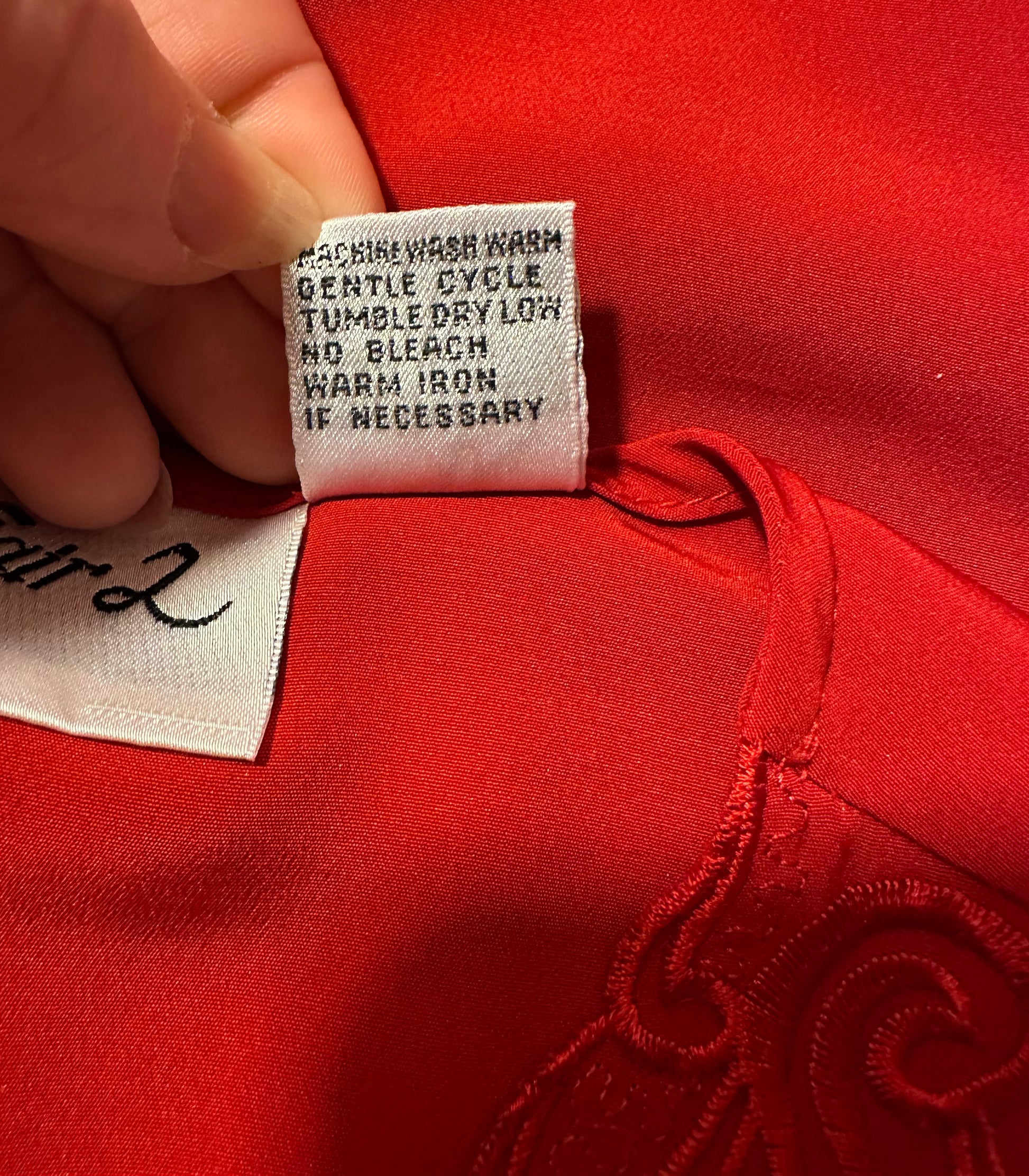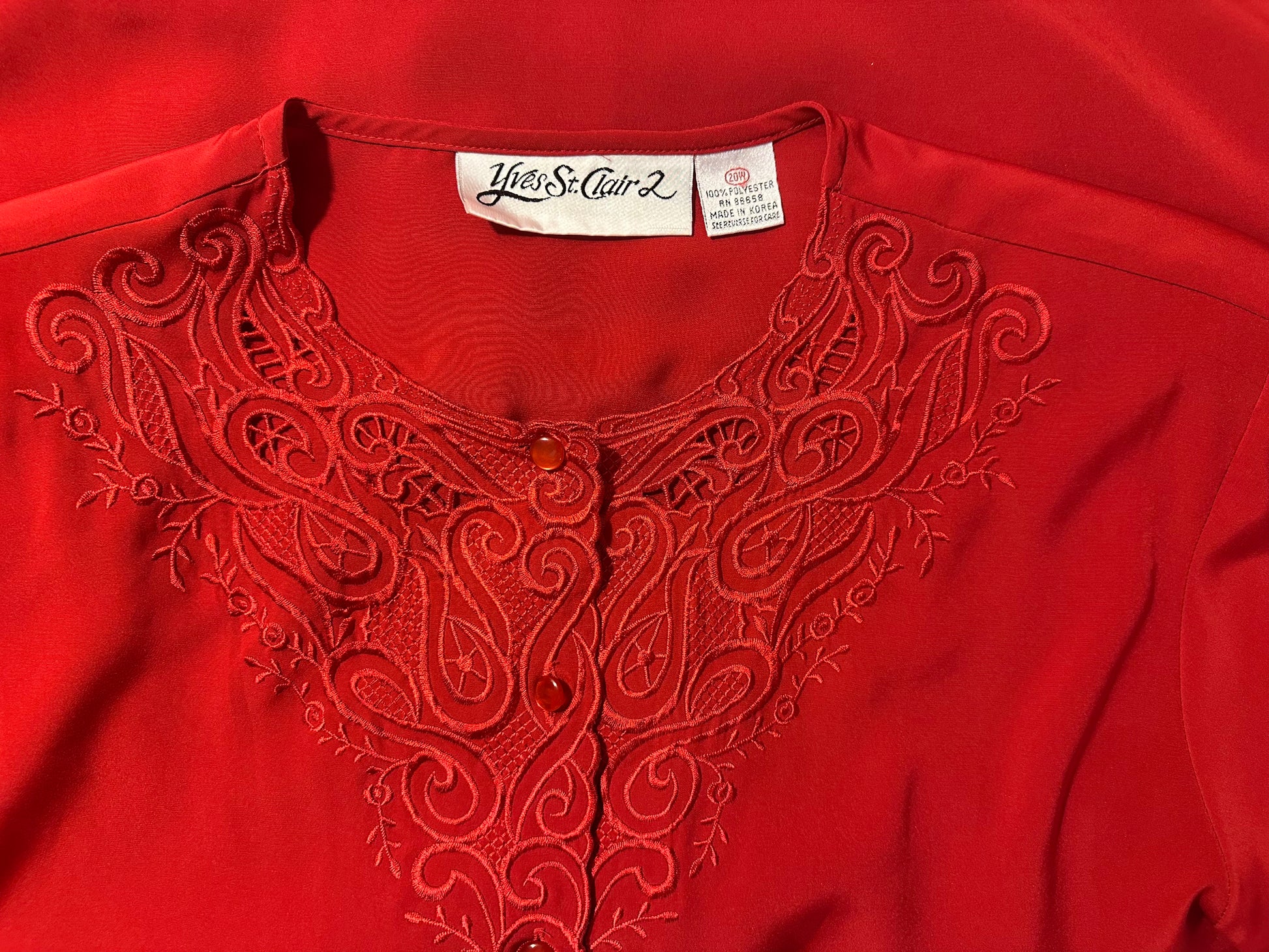 Elegant vintage Yves St. Clair blouse, estimated from the late 1980s to early 1990s, featuring exquisite tonal embroidery and scalloped detailing along the button placket. The rich red color, fluid drape, and timeless silhouette make it a perfect choice for holidays, special occasions, or elegant everyday wear. Crafted in easy-care 100% polyester with a soft, silky finish.