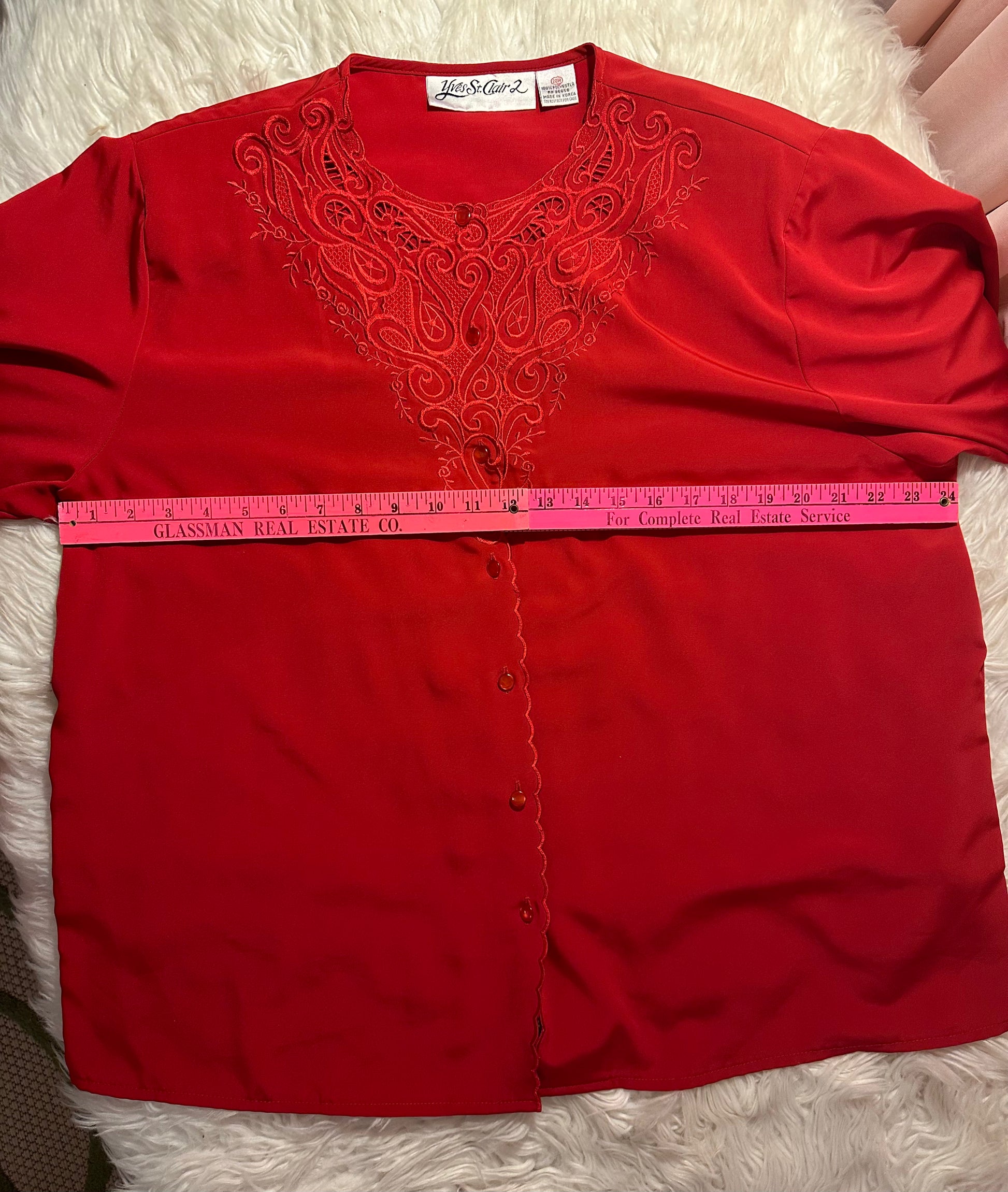 Vintage 80s Yves St. Clair Red Embroidered Blouse Long Sleeve Size 20W Holiday