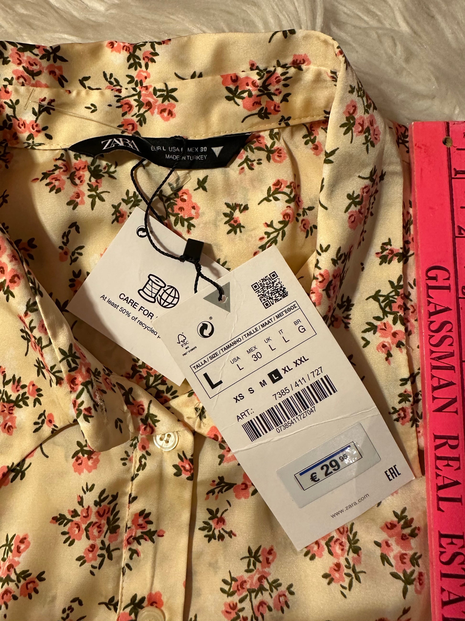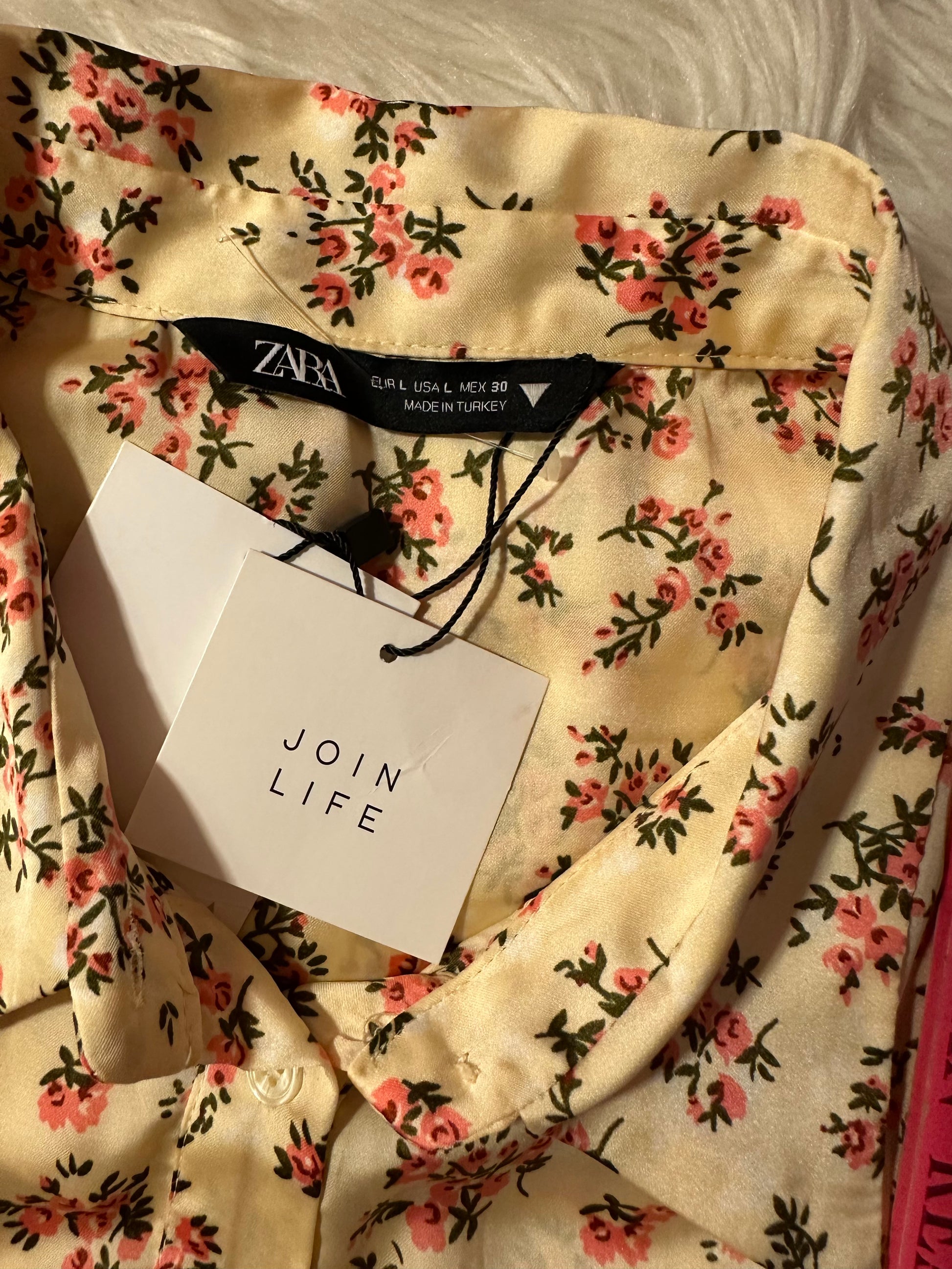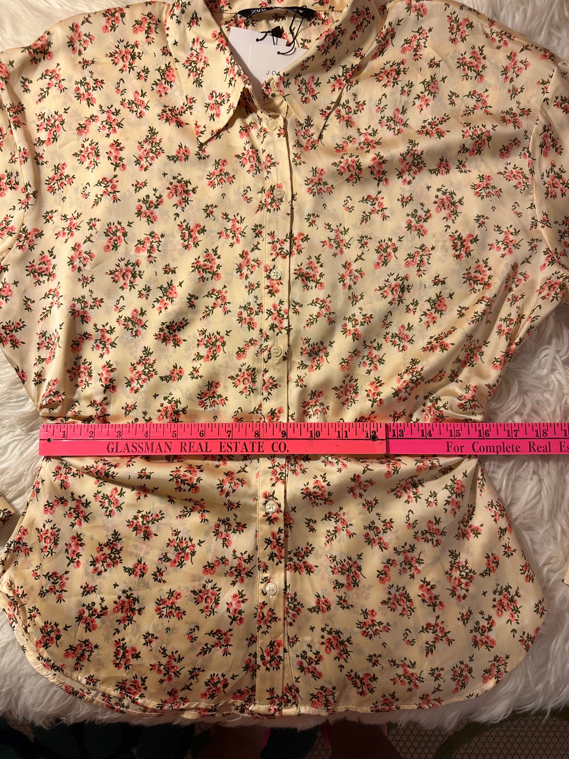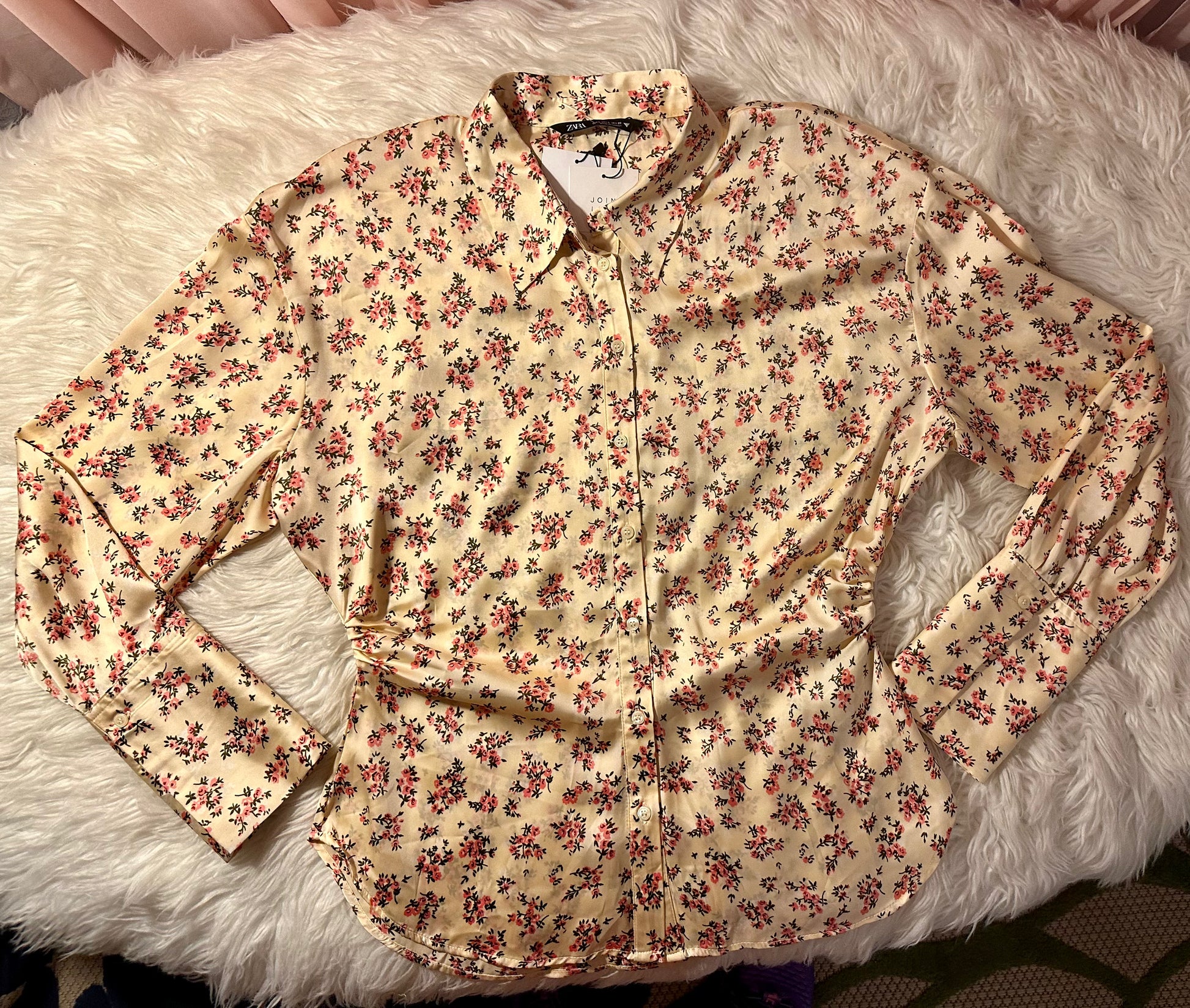 New with tags, this ZARA floral satin blouse is the perfect mix of refined and romantic. Featuring a soft, silky texture with a cream base and delicate pink floral print, this blouse elevates any look from casual to chic. The extra-long button cuffs, subtle side ruching, and classic button front add an elegant, tailored touch.